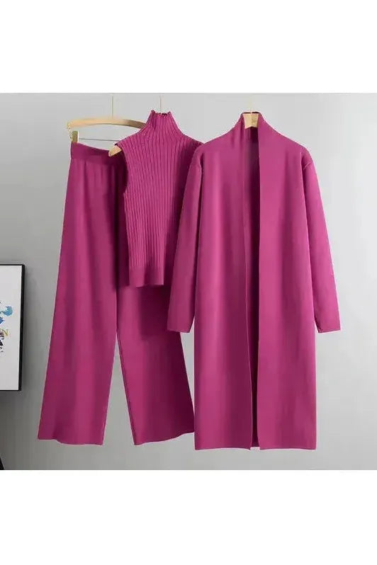 • Set Includes: Sleeveless knit turtleneck, wide-leg pants, and a longline cardigan