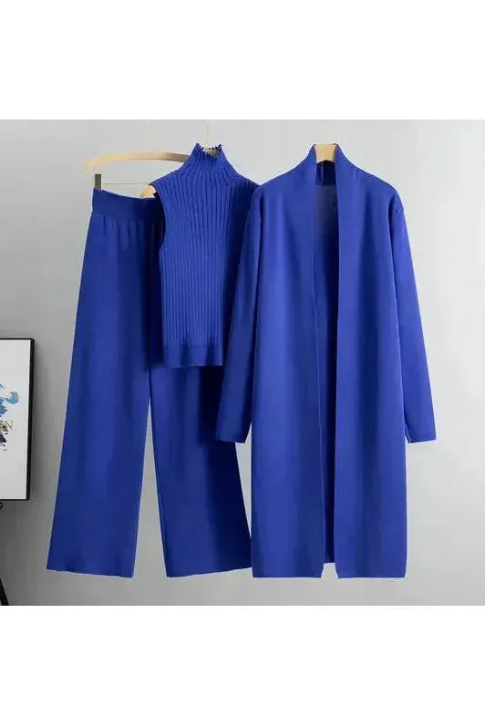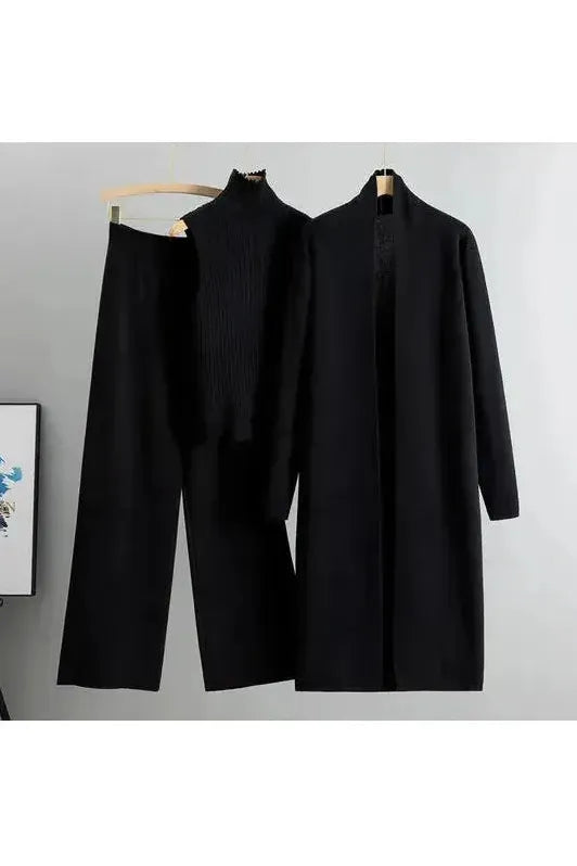 Wrap yourself in timeless sophistication and unmatched comfort with the Montreal Knitwear Set. This three-piece ensemble features a sleeveless turtleneck top, wide-leg knit pants, and a long open-front cardigan, offering a chic yet relaxed aesthetic perfect for any occasion. Designed for versatility and effortless style, this set seamlessly transitions from lounging at home to elevated casual outings.
